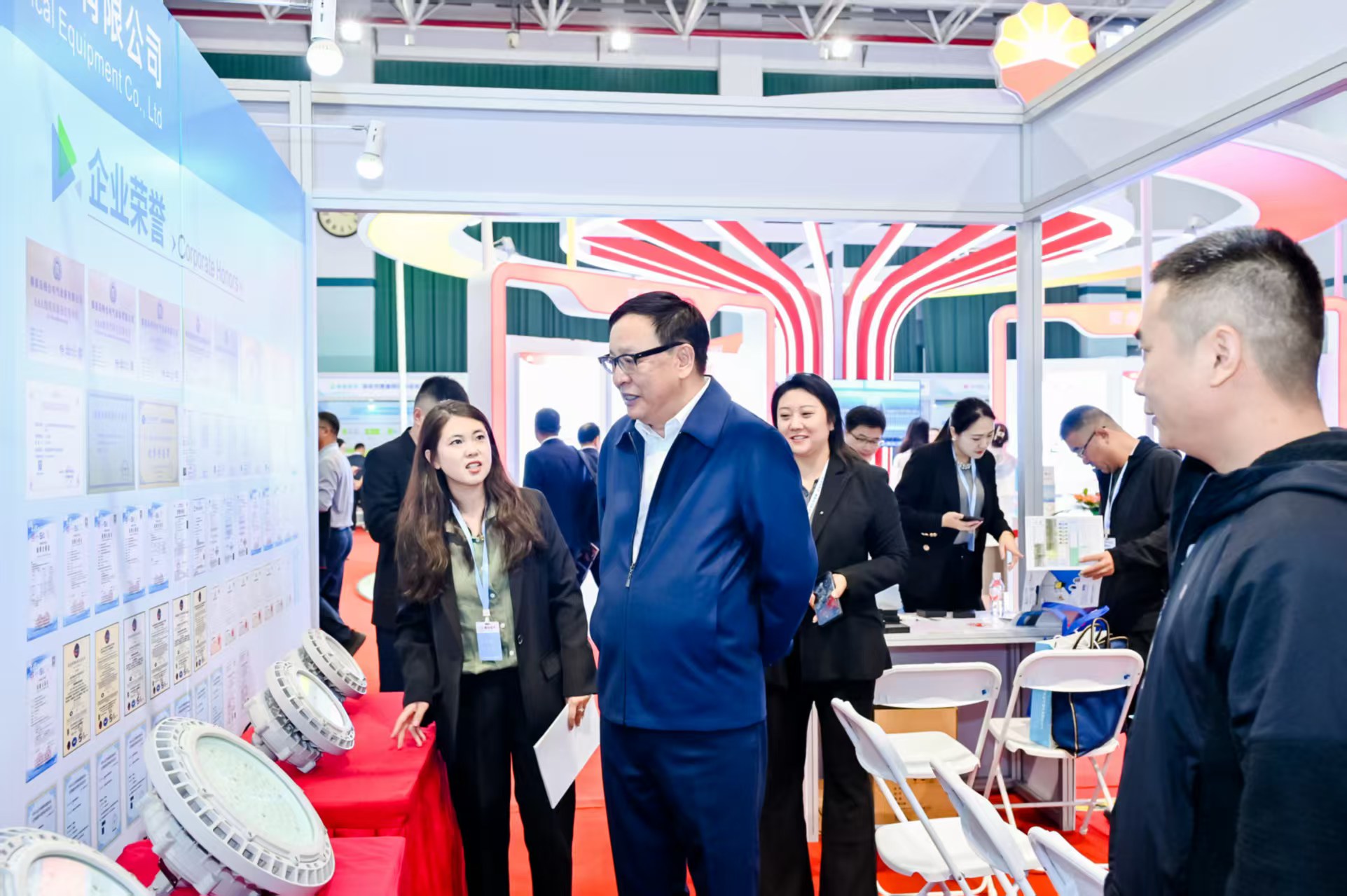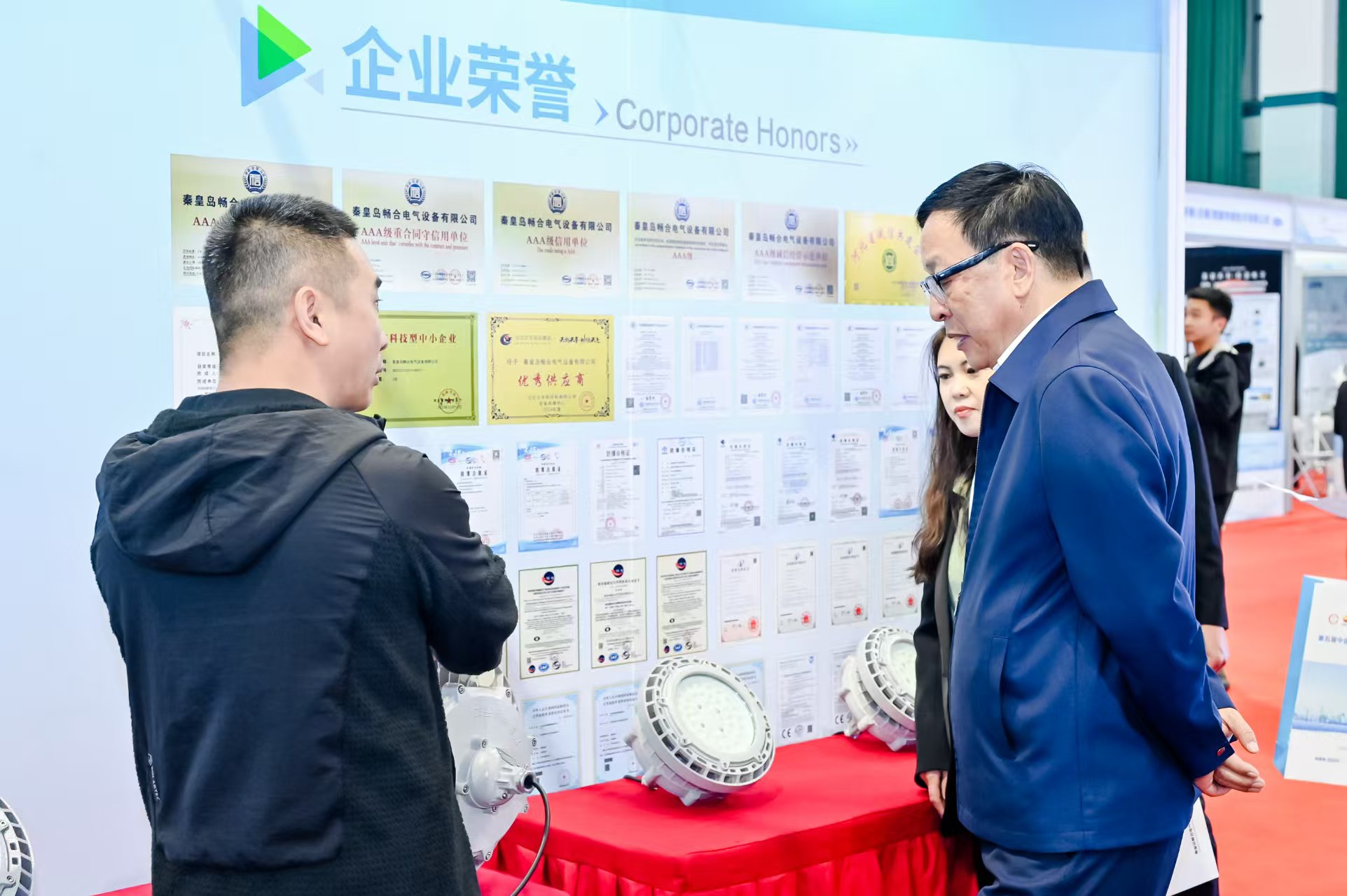 李俊軍副理事長兼秘書長蒞臨秦皇島暢合電氣展臺指導 高度贊譽防爆燈具技術成果